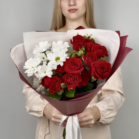 Лента атласная - 1;Современная упаковка - 1;Альстромерия - 3;Орнитогалум - 2;Хризантема кустовая белая - 2;Роза кустовая пионовидная - 2;Хризантема одноголовая местная - 1;Русскус отеч. - 5;