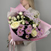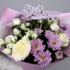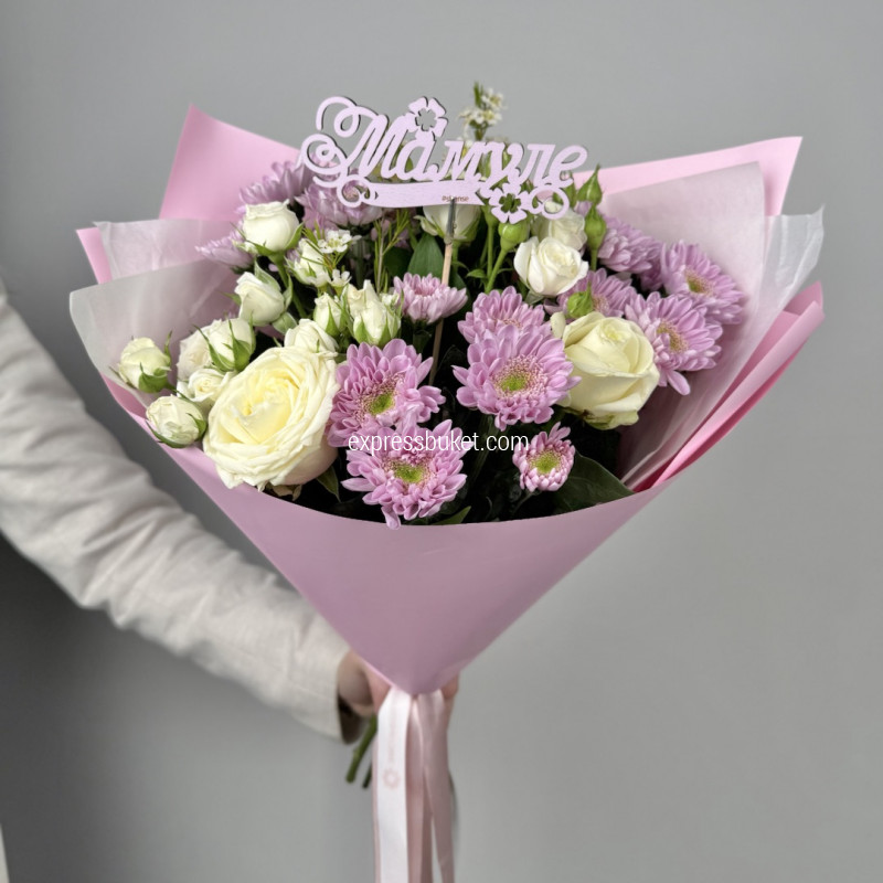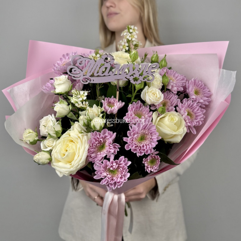 Топпер "Маме" - 1;Современная упаковка - 1;Лента атласная - 1;Хризантема кустовая розовая - 2;Роза кустовая - 1;Роза Свит Ревайвл (50см) РОССИЯ - 3;Эустома - 1;Русскус отеч. - 5;